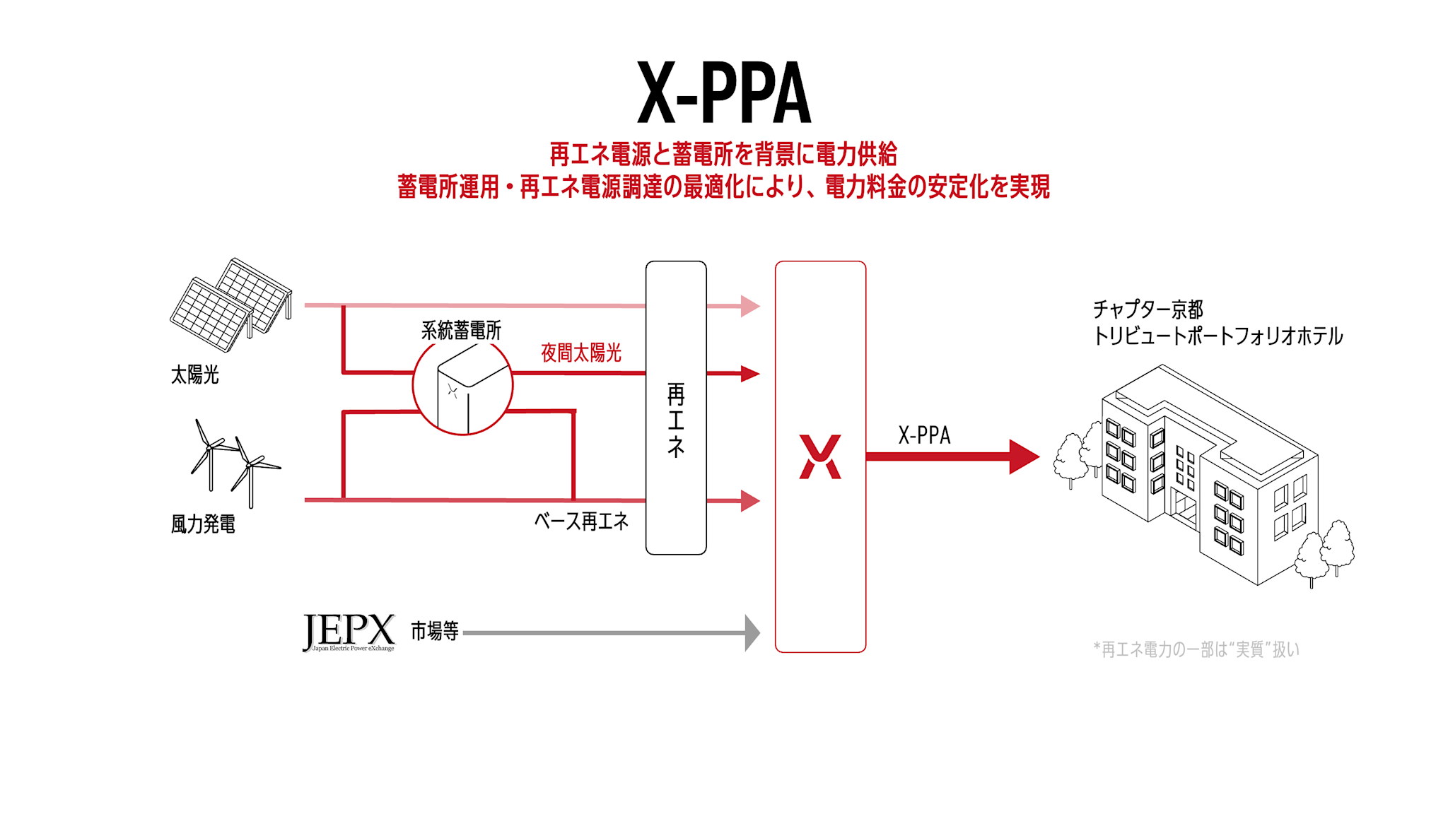 株式会社パワーエックス(東京都港区、取締役 代表執行役社長CEO 伊藤 正裕、以下「パワーエックス」)は、世界最大級のオルタナティブ投資運用会社であるブラックストーンが運用するファンドのポートフォリオ・カンパニーであるJapanCor株式会社(東京都千代田区、CEO 貝塚 浩康)がアセットマネジメントを行う「チャプター京都トリビュートポートフォリオホテル」(京都府京都市中京区)に、2024年9月より蓄電池を活用した再生可能エネルギー電力の供給を開始します。本件は、当社の電力供給サービス「X-PPA」が関西エリアの物件で初めて導入される事例となります。