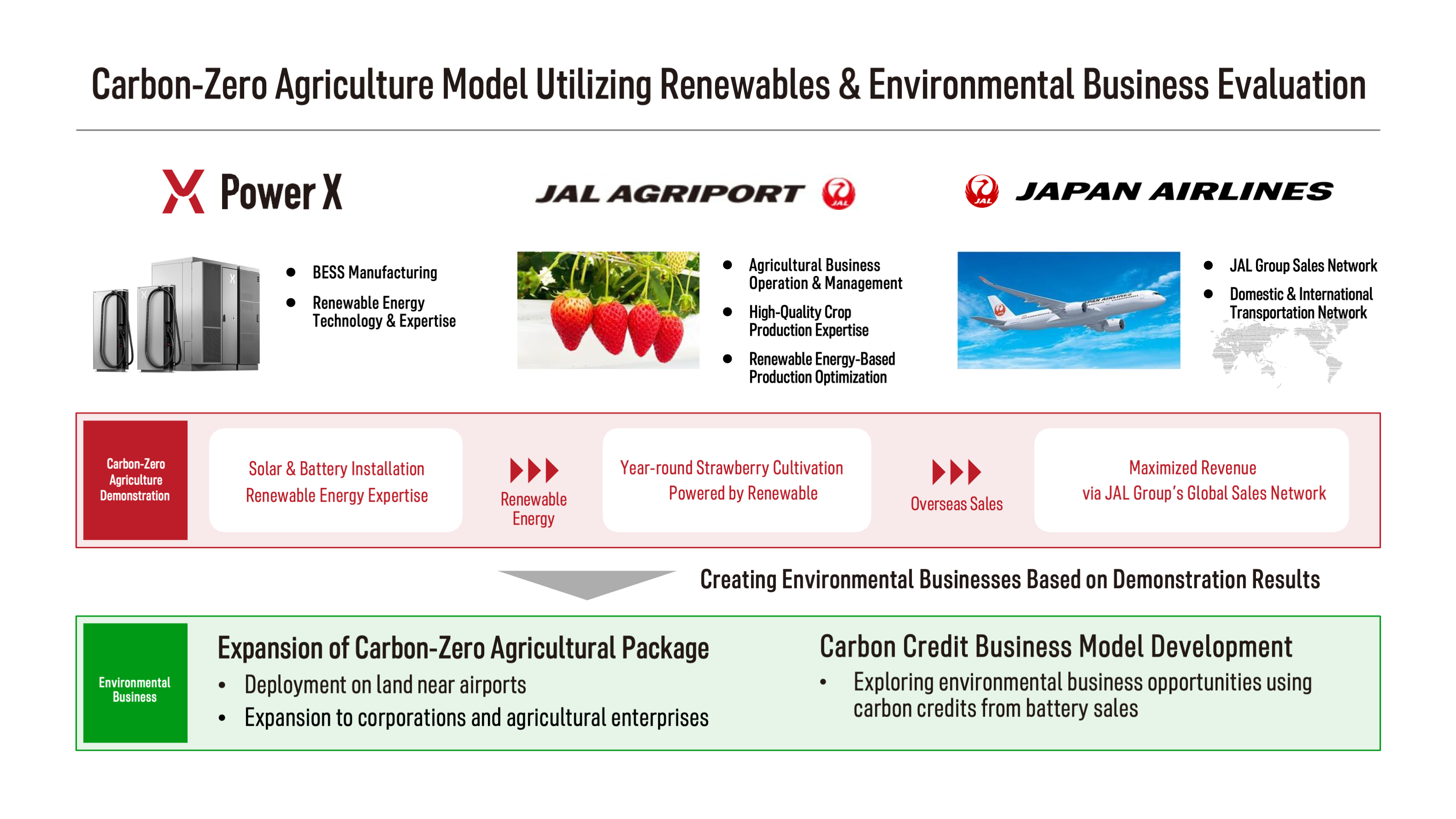 PowerX, Inc. (Head Office: Minato-Ku, Tokyo, Japan; Director, President & CEO: Masahiro Ito, hereinafter “PowerX”), Japan Airlines Co., Ltd. (Headquarters: Shinagawa-Ku, Tokyo, President & Group CEO : Mitsuko Tottori, hereinafter “JAL”), and JAL Agriport Co., Ltd. (Headquarters: Narita City, Chiba Prefecture; President: Kenichi Hanamasu, hereinafter “JAGRI”) (*1) have launched a strategic partnership to promote renewable-energy use in agriculture, explore its wider deployment, and examine new environmental businesses—including carbon-credit initiatives.