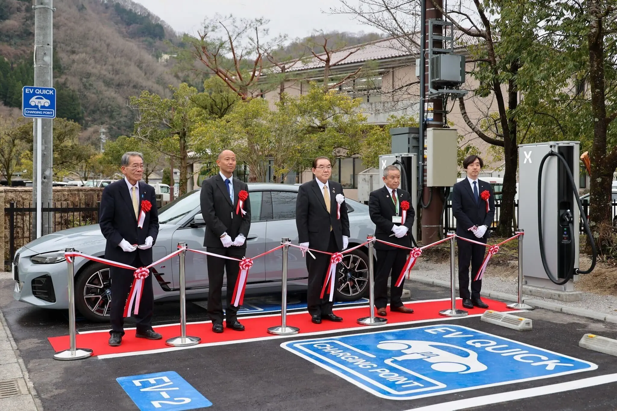 今回設置されたEV充電器のテープカットセレモニーが、3月25日に戎斉新見市長、さんびるホールディングス株式会社の田中正彦代表取締役、さらに当社代表の伊藤正裕をはじめとする関係者のご出席の下、執り行われました。