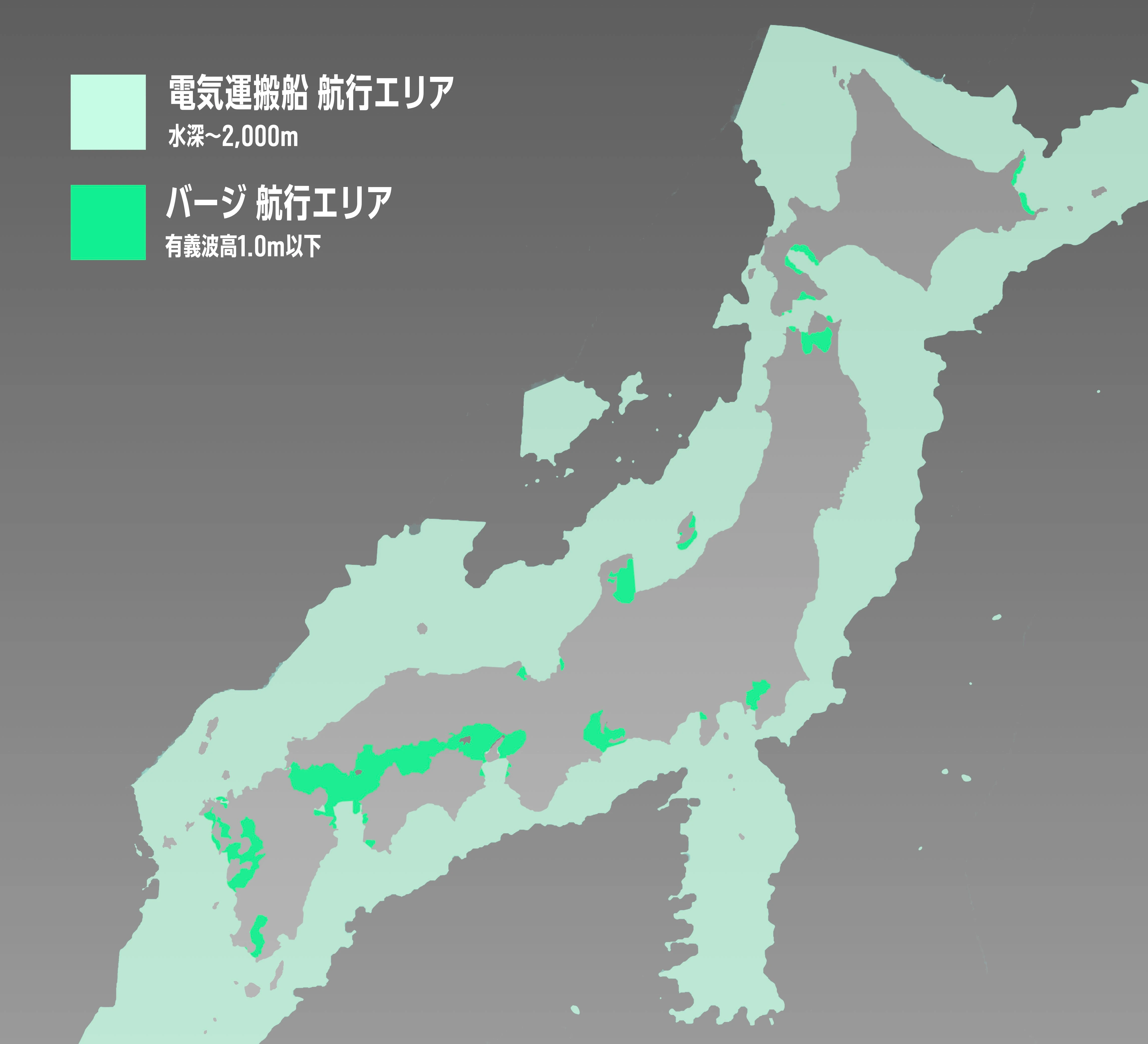 「Power Barge」は、全長約81m、載貨重量約6,000tに及ぶ大型バージ船で、推進機関を持たず、効率的に大量の荷物を運ぶために設計されています。このバージ船は主に、日中に太陽光発電などにより生成された余剰電力を、都市部などの電力需要地へ送電する役割を担っています。「Power Barge」には、パワーエックス社製のコンテナ型リン酸鉄リチウムイオン蓄電池が96個搭載されており、これにより一度に最大240MWhの電力(約24,000世帯が1日に利用する量)を運ぶことができます。筏形状の船体を持つため、「Power Barge」は瀬戸内海のような月平均有義波高が1.0m以下の穏やかな海域での使用に最適化されており、電気運搬船「Power Ark」と比べて、コストを抑えることが可能な船として設計されました。