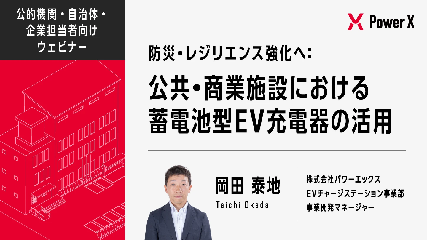 本ウェビナーでは、平常時はEV充電インフラとして活用し、災害時には非常用電源として機能する蓄電池型EV充電器の導入メリットを解説します。直近で導入予定の公共施設、商業施設、などの具体的な事例を通じて、災害時の電力供給能力や補助金の活用方法など詳しくご紹介します。