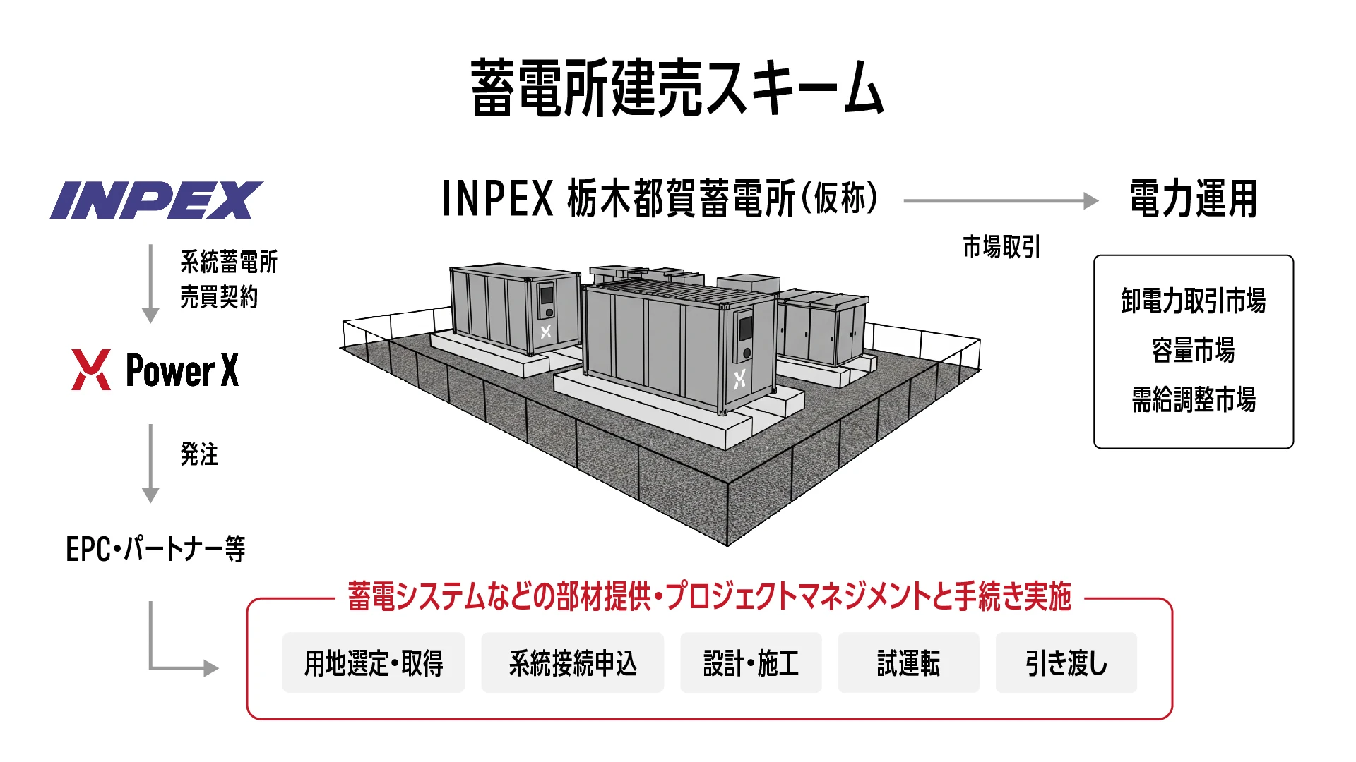 株式会社パワーエックス(本社:岡山県玉野市、取締役 代表執行役社長CEO:伊藤 正裕)は、株式会社INPEX(本社:東京都港区、代表取締役社長:上田 隆之)より、事業用地から自社製蓄電システムを含む機器一式、系統接続手続きまでを一体提供するスキームで、高圧系統蓄電所1拠点を受注しました。