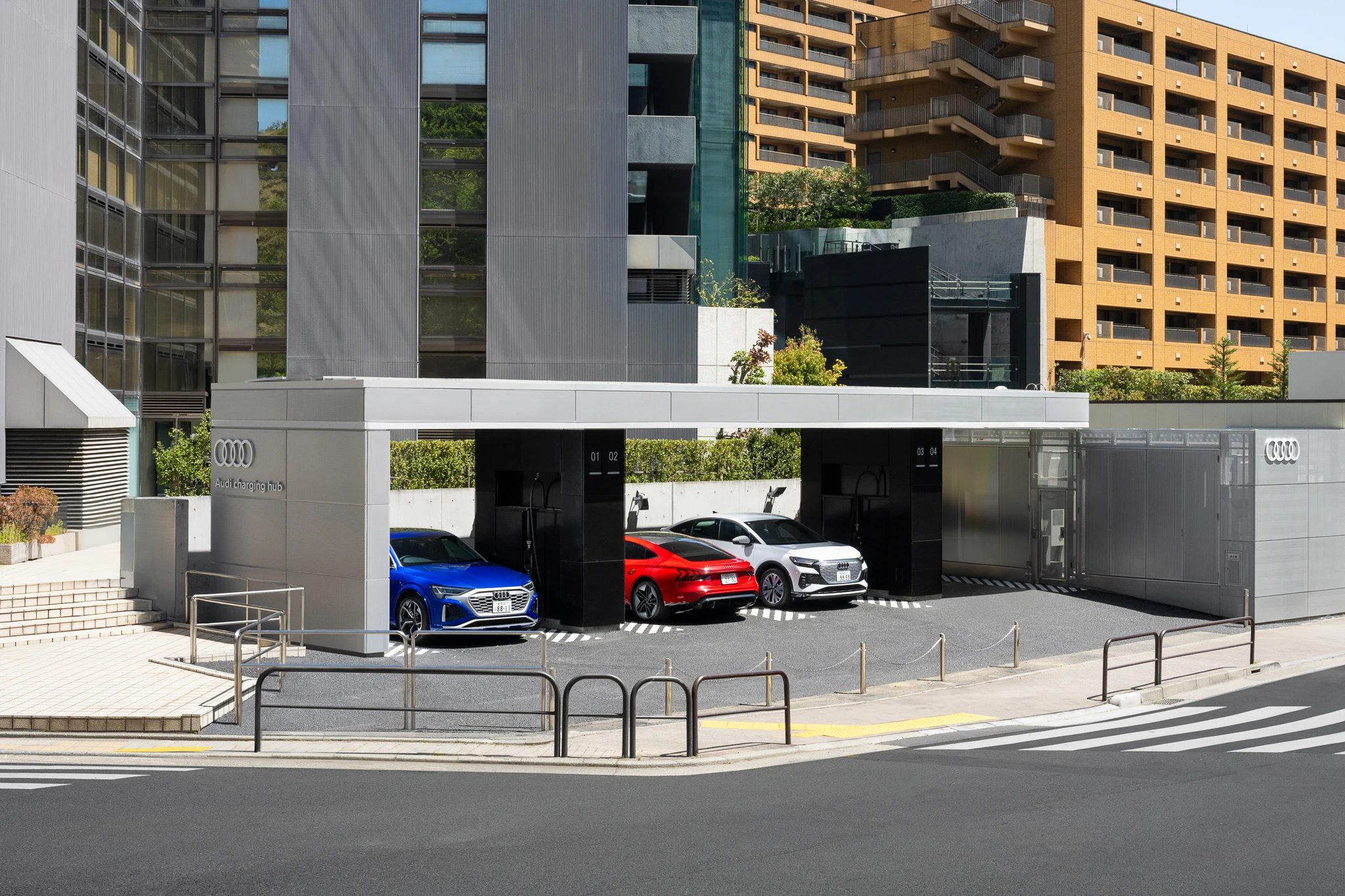 『Audi charging hub 紀尾井町』は、4口の充電ポートを備えた急速充電施設で、最大出力150kWで車両を充電します。当拠点の開設を通じて、アウディは都市部における「充電拠点不足」「自宅で充電できない」「充電にかかる時間が長い」などの電気自動車の課題解決に貢献します。『Audi charging hub 紀尾井町』は、アウディ全体で7番目、ヨーロッパ以外で初となる拠点です。アウディのe-tronモデルをご利用のお客様だけでなく、すべての電気自動車ユーザー*が利用できます。当社が開発・製造する蓄電池を搭載した「Hypercharger」を採用することで、電力系統に対する負荷を低減しながら、超急速充電による利便性を提供します。