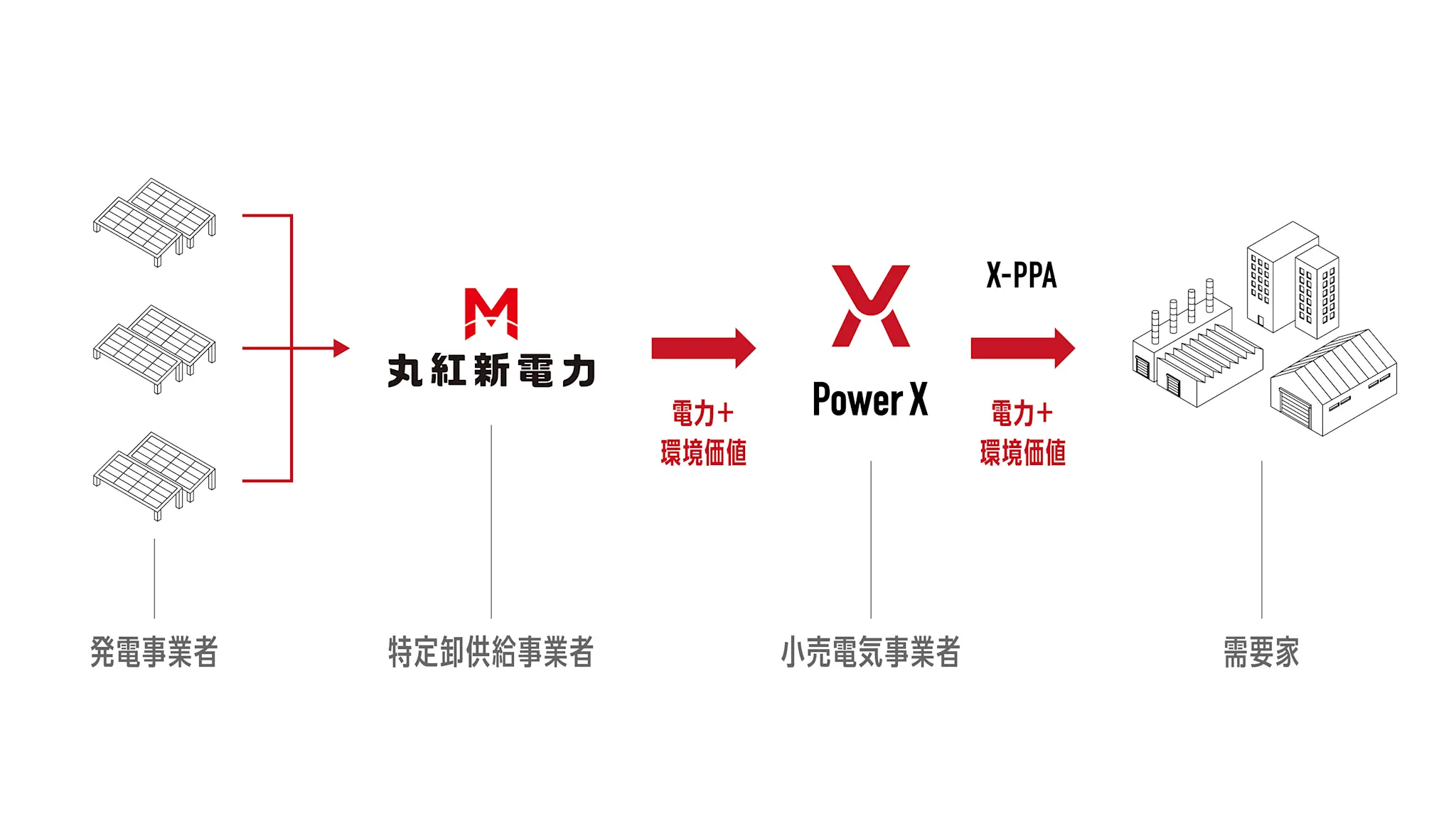 この契約に基づき2024年10月より、丸紅新電力は特定卸事業者として、複数の発電事業者が保有するFIPおよびNonFITの太陽光発電設備(パネル容量で約3MW)から再エネ電力を束ね、小売電気事業者であるパワーエックスに供給します。
