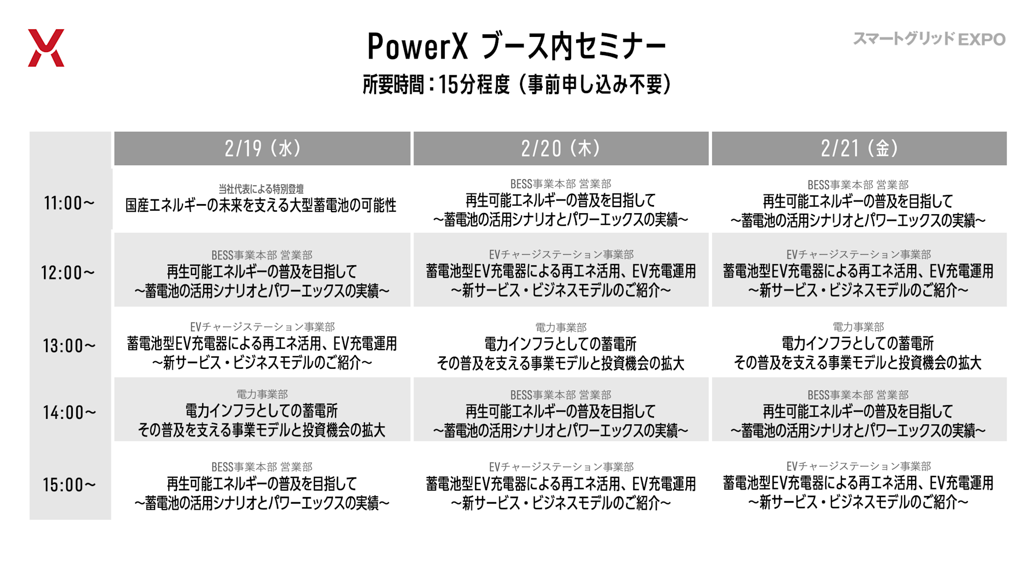 株式会社パワーエックスは、2月19日(水)から2月21日(金)まで、東京ビックサイト(東京都江東区)で開催される「第23回 SMART ENERGY WEEK【春】」の構成展「第17回 [国際]スマートグリッド EXPO[春]」に出展します。皆さまのご来場を心よりお待ちしております。