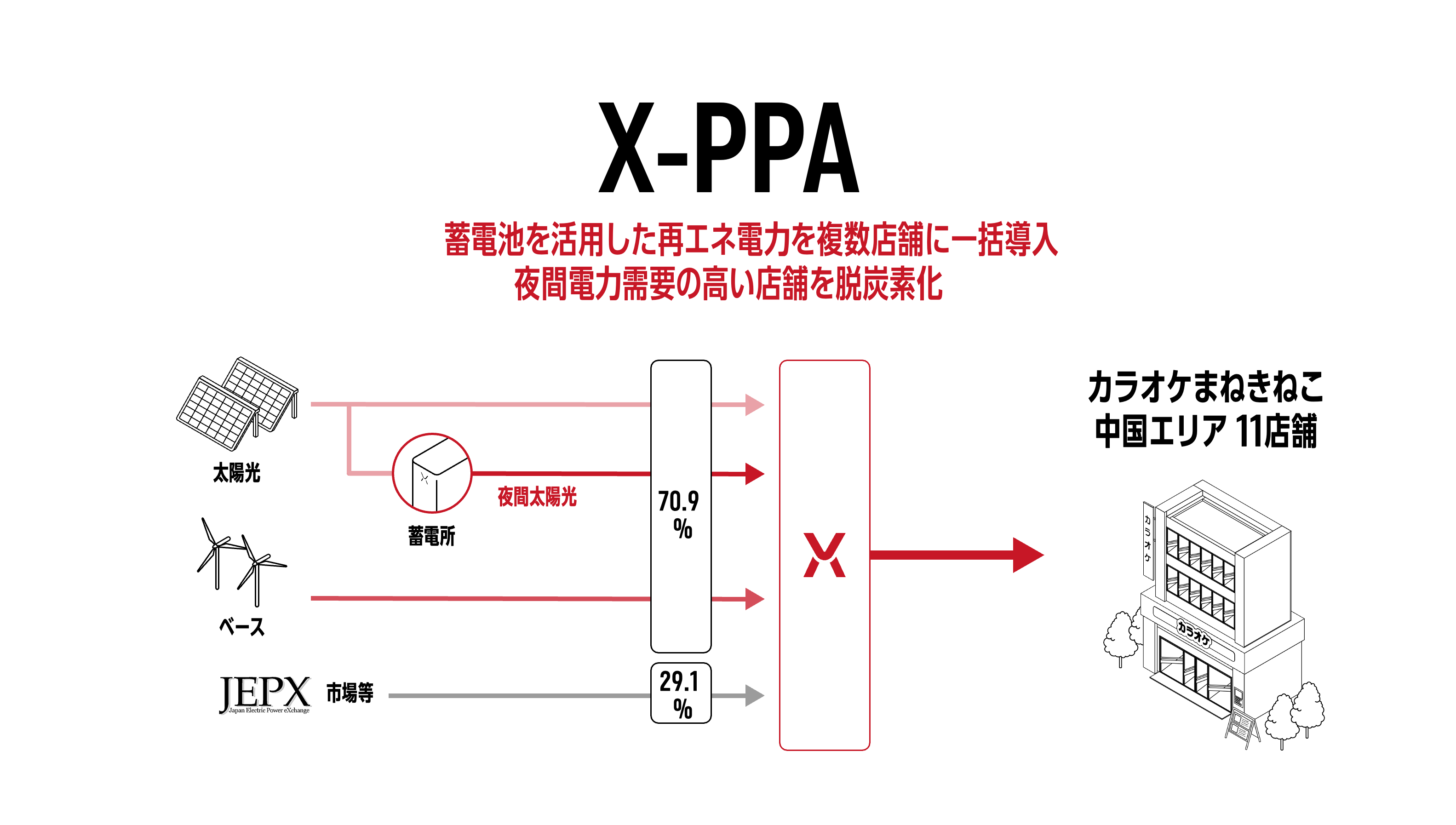 パワーエックスの「X-PPA」は、風力発電などのベース電源に加え、昼間の太陽光と、日中に太陽光によって発電された電力を蓄電池に貯め、電力需要の高まる夕方以降の時間帯に「夜間太陽光」として供給する電力を組み合わせることで、ビルや商業施設、店舗に最適な電力サービスです。今回導入するカラオケ店は夜間の電力需要も高く、蓄電池を活用する本サービスの強みを最大限に引き出せます。
