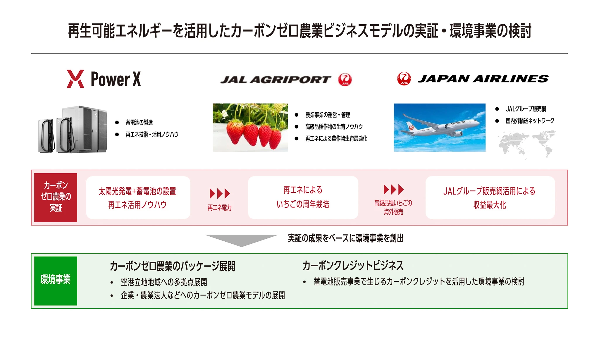 株式会社パワーエックス(本社:東京都港区、取締役 代表執行役社長CEO:伊藤 正裕、以下「パワーエックス」)、日本航空株式会社(本社:東京都品川区、代表取締役社長 グループCEO:鳥取 三津子、以下「JAL」)、JAL Agriport株式会社(本社:千葉県成田市、代表取締役社長:花桝 健一、以下「JAGRI」)(*1)の3社は、農業領域における再生可能エネルギーの活用と、その展開ならびにカーボンクレジット関連を含む環境事業の検討を開始しました。